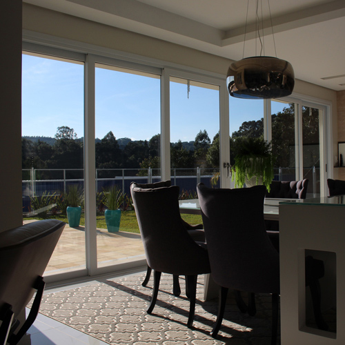 Obra de alto padrão com perfis utilizados nas linhas euroTec e TECplus para os vãos maiores. Foram instalados vidros duplos nos ambientes, garantindo conforto térmico e acústico em todas partes da casa. Os vãos grandes proporcionam economia em iluminação e requinte. Para unir praticidade e beleza, a casa foi equipada com persianas motorizadas em todos dormitórios.